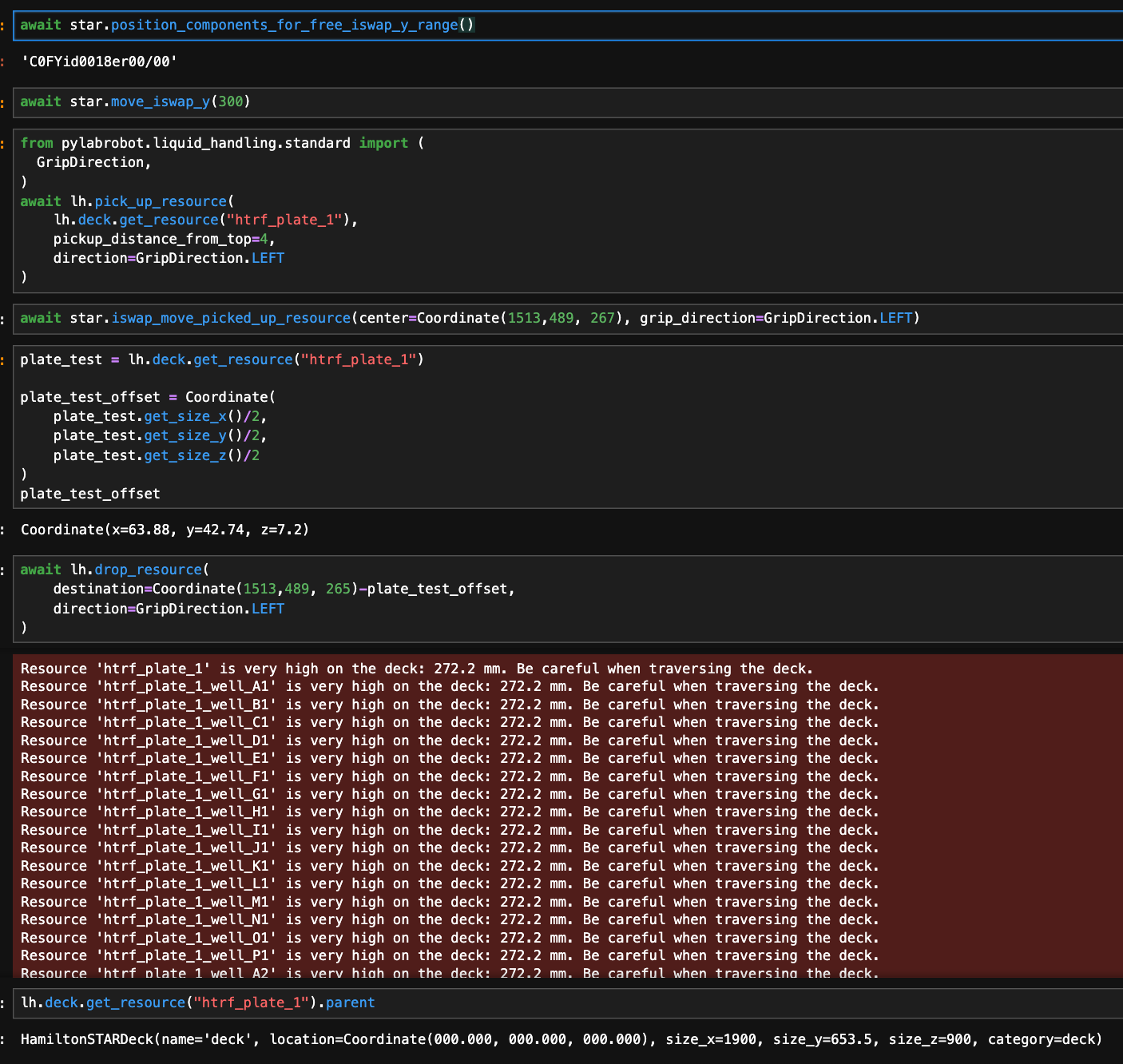 What is annoying: when you set a resource’s location, that is the location of its left front bottom LFB. This means that when you put a resource somewhere with an arm physically, and then you request the current arm location, the arm reports that location in CCB, which is not actually the location that the given resource should be set to. You have to figure out what plate you were holding to find the actual LFB of the destination. It also matters where on the resource it was gripped: obviously the bottom of the resource depends on the resource’s pickup height.