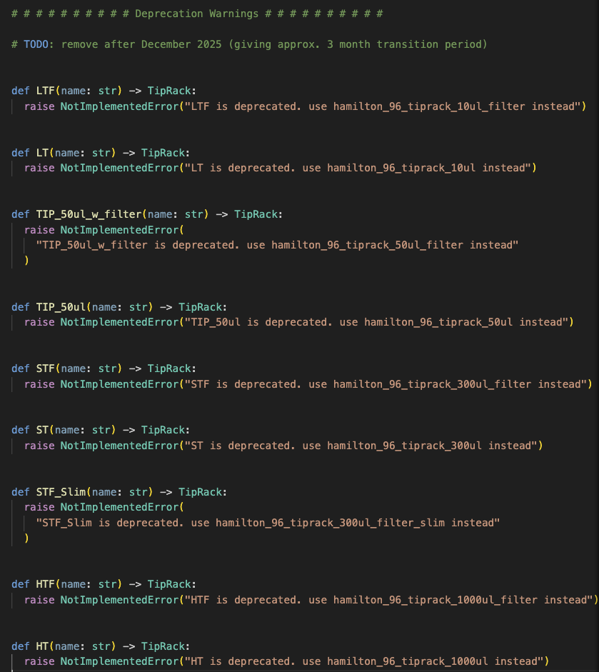 If you have old scripts running with the previous naming, deprecation warnings telling you what to replace your old tiprack name will appear during instantiation (i.e. most likely at the beginning of your script).