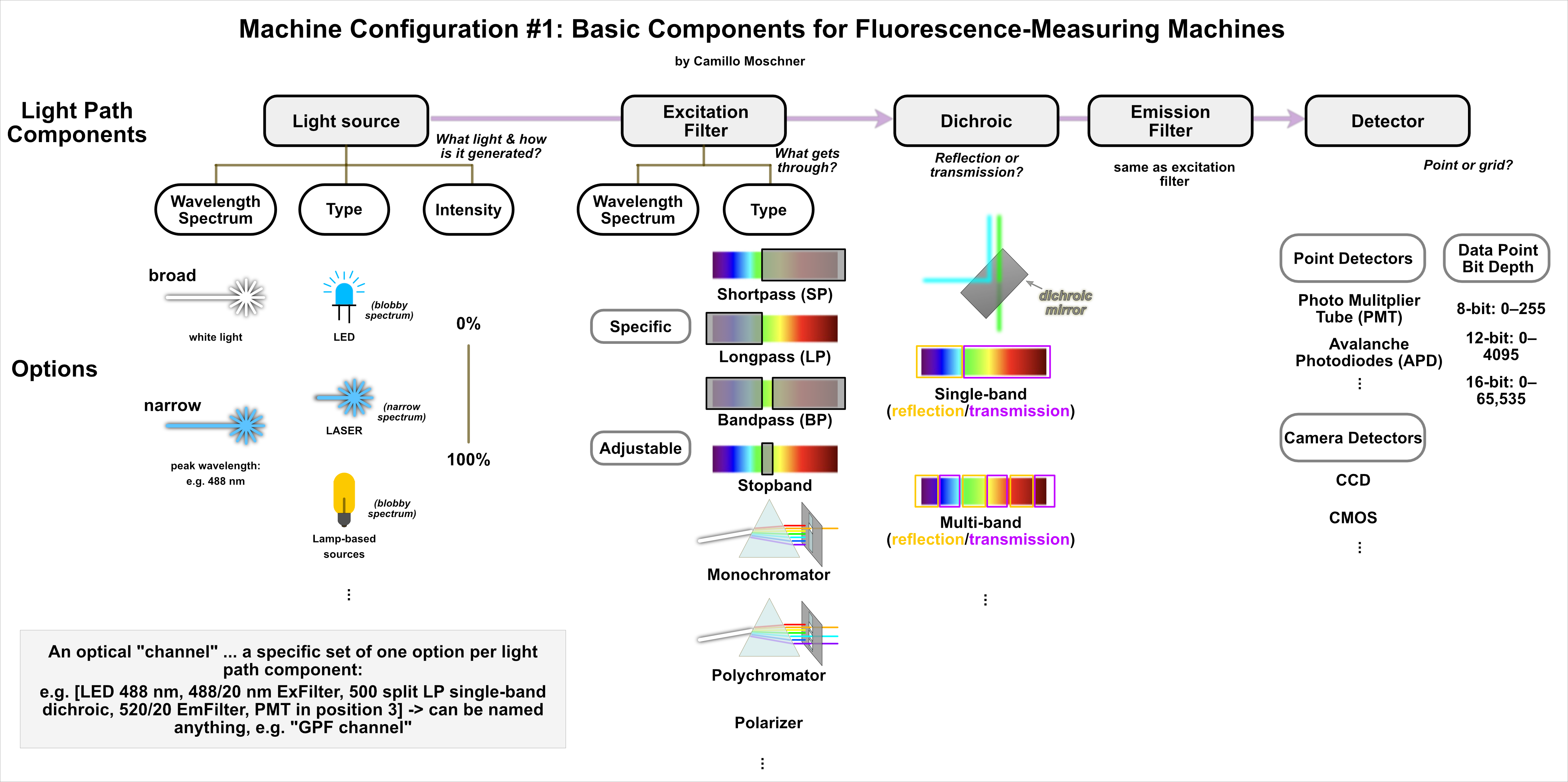 Note note: in theory all one needs is [light source] → [dichroic] → [detector] but in practice the filters are usually needed to tune the light path (most light sources are not a single wavelength but rather spectra of their own, i.e. “blobby”)